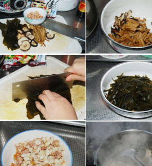 做法很简单:锅里加水烧开把牛肉丁煮熟,下入花生煮到花生仁颗粒饱满,想吃脆点的花生,这时就可下入海带丝、豆筋丝、黄花菜段,再煮十来分钟,放入粉条出锅前加入辅料胡椒粉、生姜粉、十三香、盐、淀粉、搅匀。最后点些味精或鸡精。