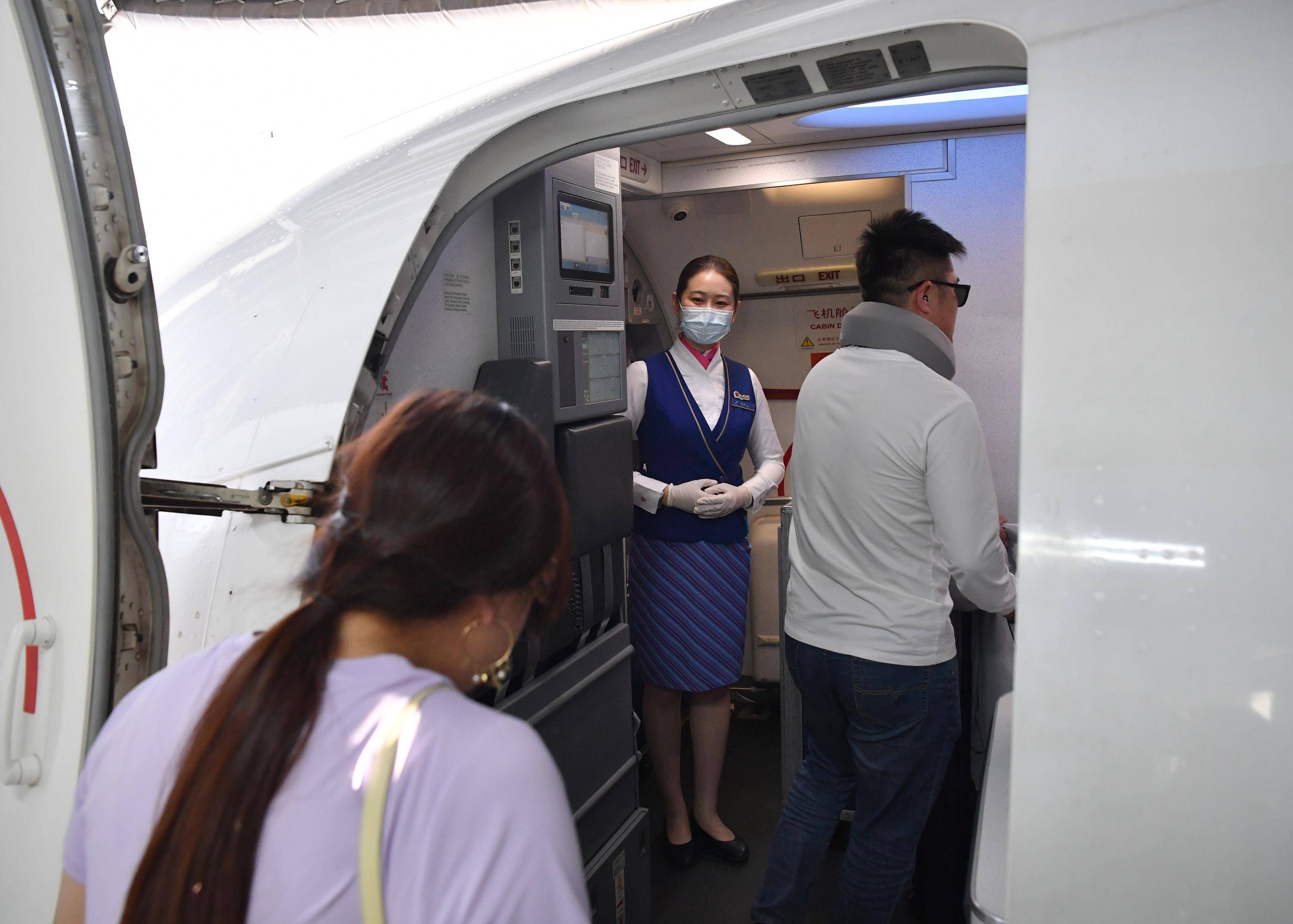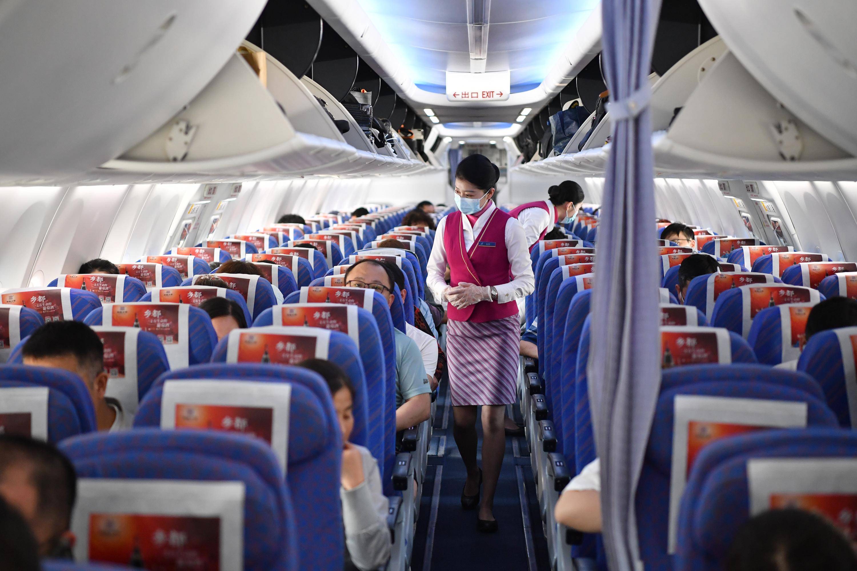 5月13日,在西安-乌鲁木齐-阿什哈巴德首趟航班上,乘务员在起飞前进行客舱安全检查。 新华社记者 邵瑞 摄
