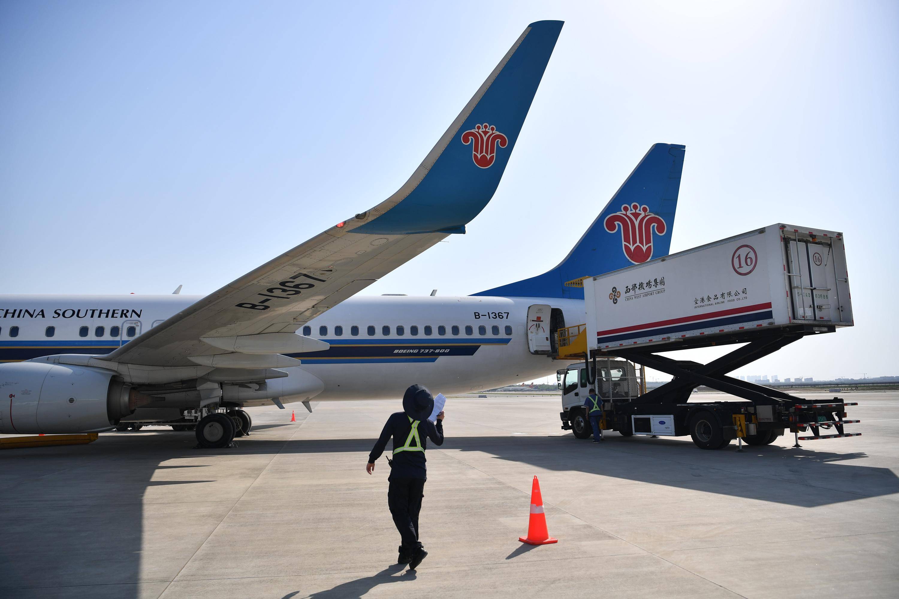 5月13日,西安-乌鲁木齐-阿什哈巴德首趟航班在进行飞行前的准备工作。 新华社记者 邵瑞 摄