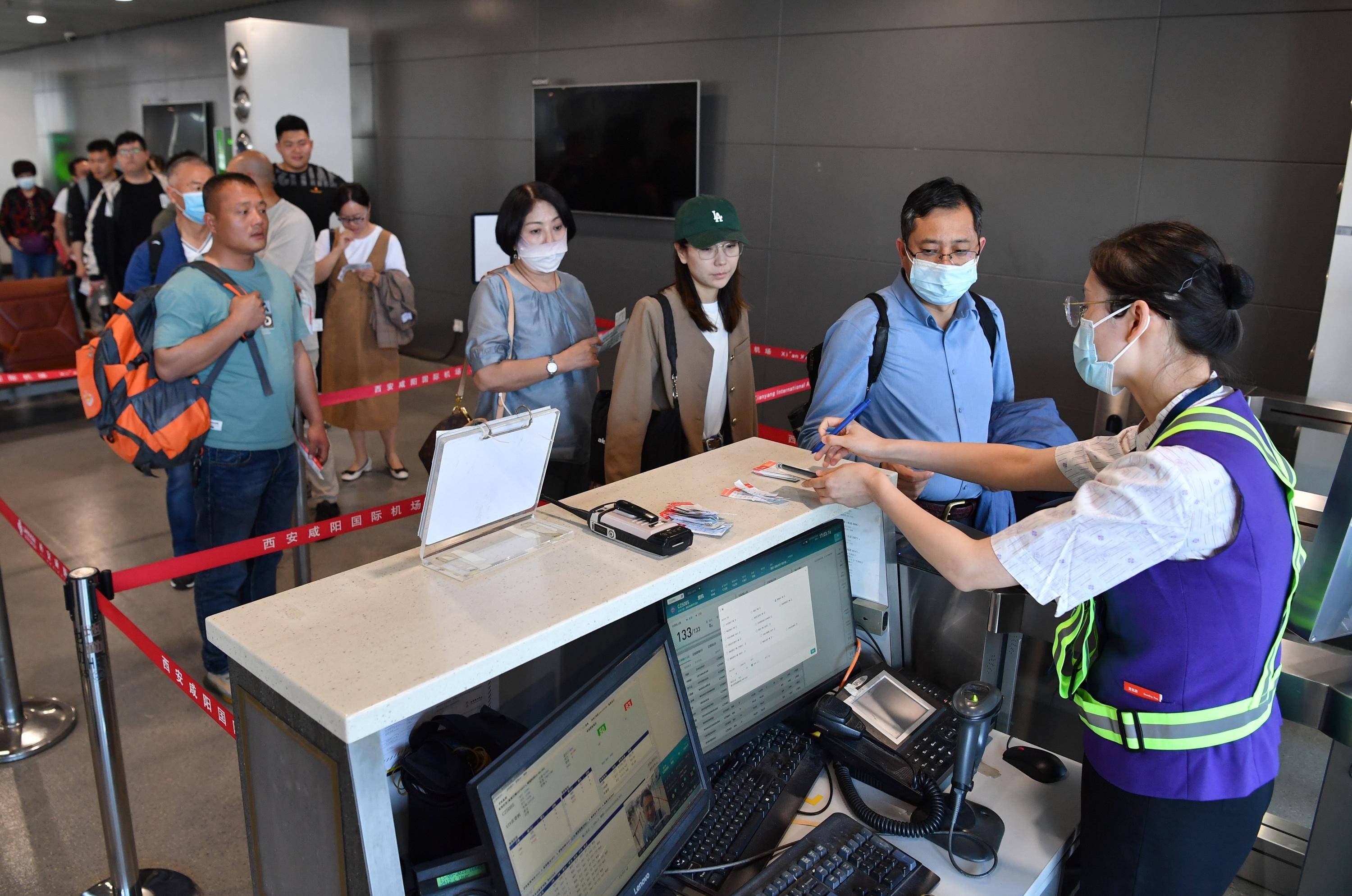 5月13日,乘坐西安-乌鲁木齐-阿什哈巴德首趟航班的旅客准备登机。 新华社记者 邵瑞 摄