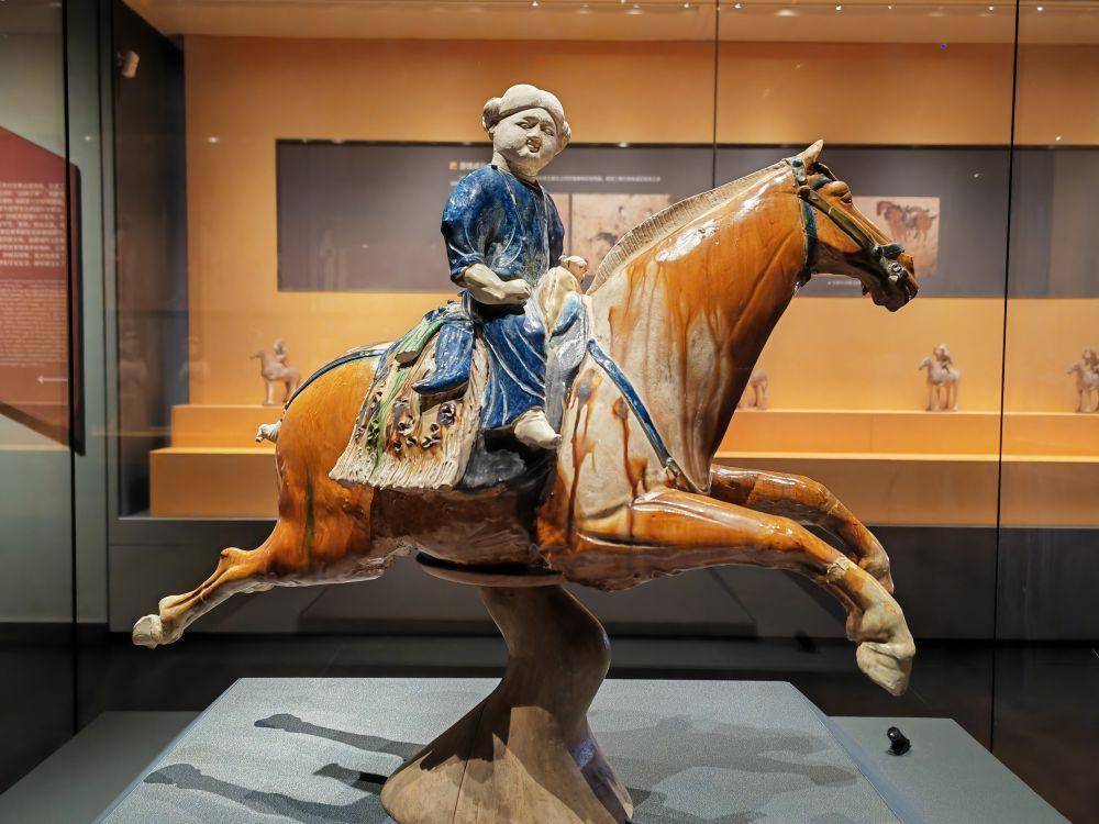 蓝衣少年,正是这场“长安有故里——丝路少年大唐行”展览的主角。他的形象,取自西安博物院“明星”藏品唐代三彩腾空马之上的西域骑手。