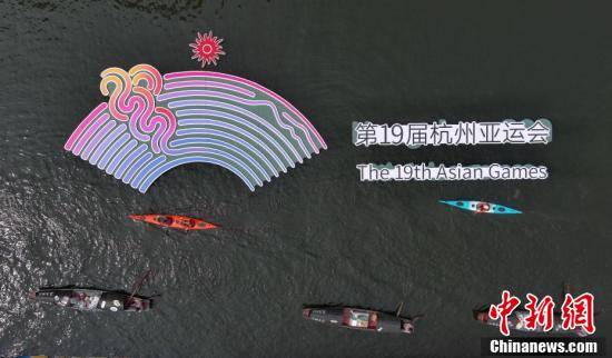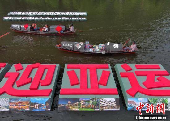绍兴作为承办杭州亚运会比赛项目最多的协办城市,将承办篮球、排球、棒球、垒球、攀岩5个项目。图为放置中国结和亚洲国家特色景点照片的乌篷船从杭州亚运会标识前划过。王刚 摄