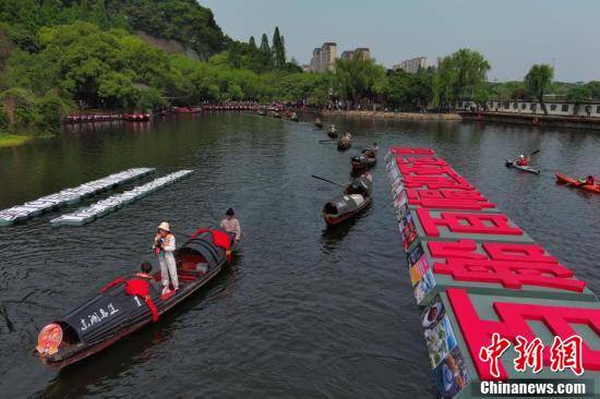 5月13日,“稽山秀水古越景 百船百幅迎亚运”主题摄影展活动在浙江绍兴东湖景区举行。百条乌篷船船头各放置一张亚洲国家最具特色的景点照片,采用乌篷船表演结合水上立体型展陈方式,融合亚运元素与传统文化,喜迎杭州2022年亚运会的到来。图为乌篷船和皮划艇从杭州亚运会标识前划过。王刚 摄