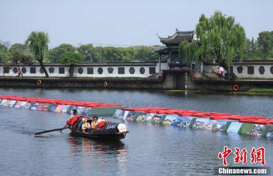 多张亚洲国家特色景点照片在乌篷船船头展出。王刚 摄