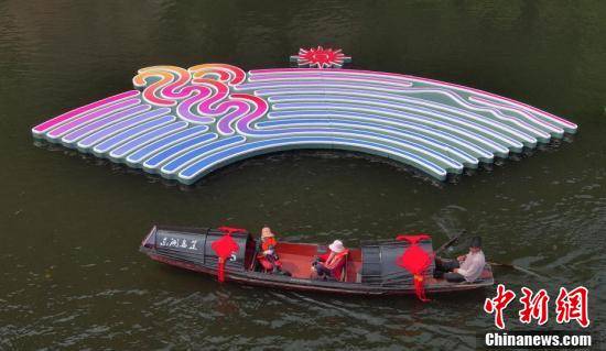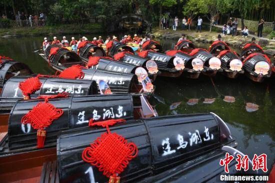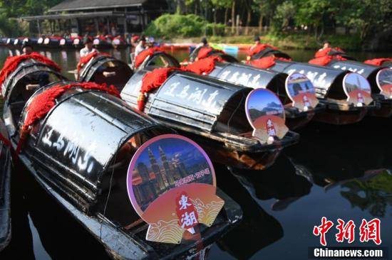 游客在东湖景区乘坐放置着亚洲国家特色景点照片的乌篷船。王刚 摄