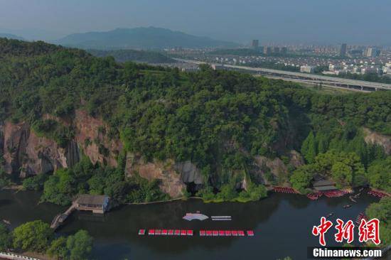绍兴东湖景区核心水域呈现出杭州亚运会标识以及“稽山秀水古越景百船百幅迎亚运”字样。王刚 摄
