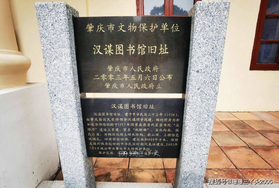 在宝月台菩提树的旁边,珊珊三丫头看到一幢有2层楼高的古建筑,在建筑旁的石刻和碑文记载,我得知其身份:汉谋图书馆。在1933年春天,肇庆籍的国民革命军军长余汉谋在参观高要县立中学时,发现学校内的图书馆残旧并缺少图书,于是,余汉谋几次捐款捐书,还动员当时当地的达官贵人捐款捐书,并在高要县立中学内,原星岩书院众绿厅处改建了这个图书馆,在民国二十三年(1934年)2月1日,这个图书馆建筑至今被保存完好。