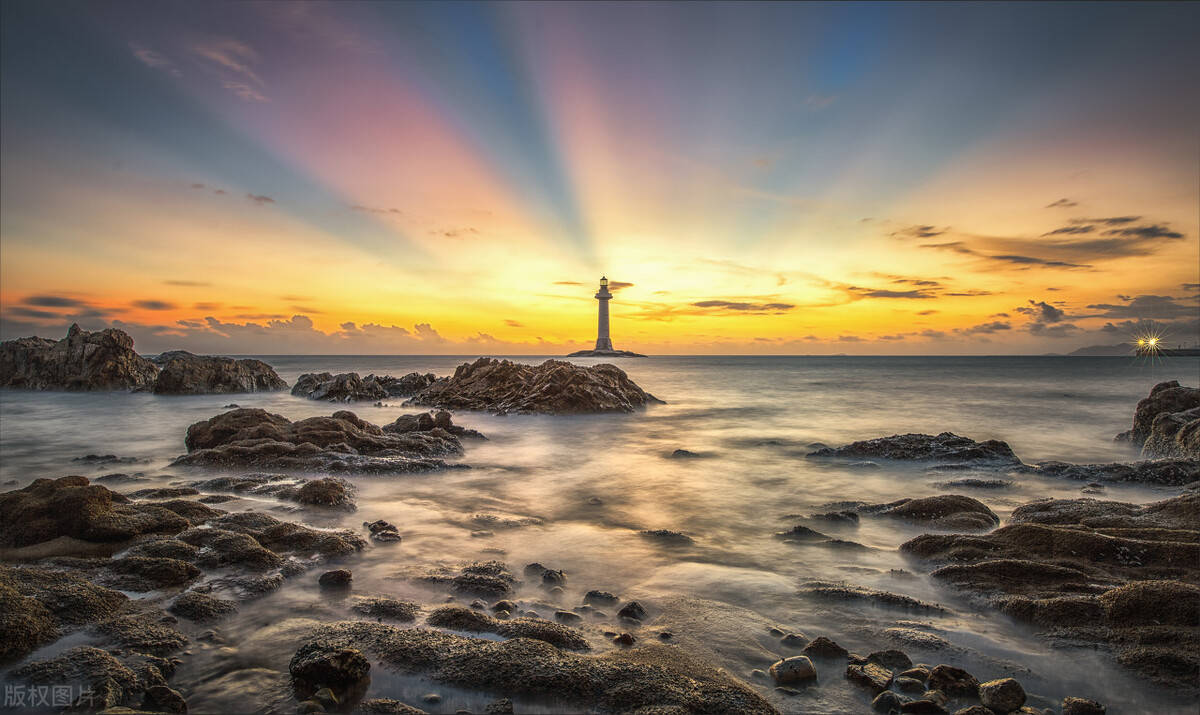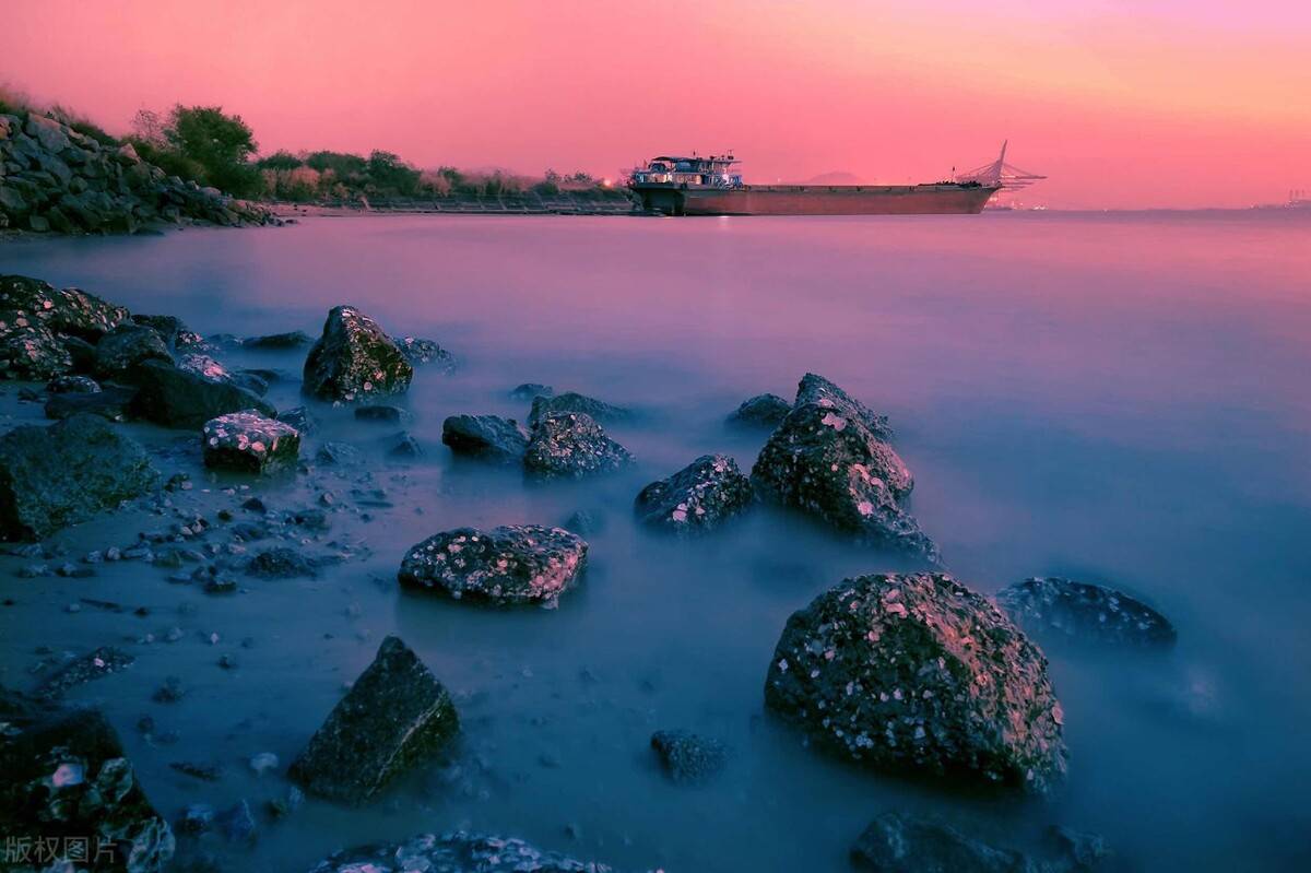 海面是广阔且平静的,如果只拍摄海面,会让照片显得单调,因此我们可以适当在画面中加入其它视觉元素,比如岩石、轮船、沙滩等,这样可以让照片更有画面感,层次更丰富。