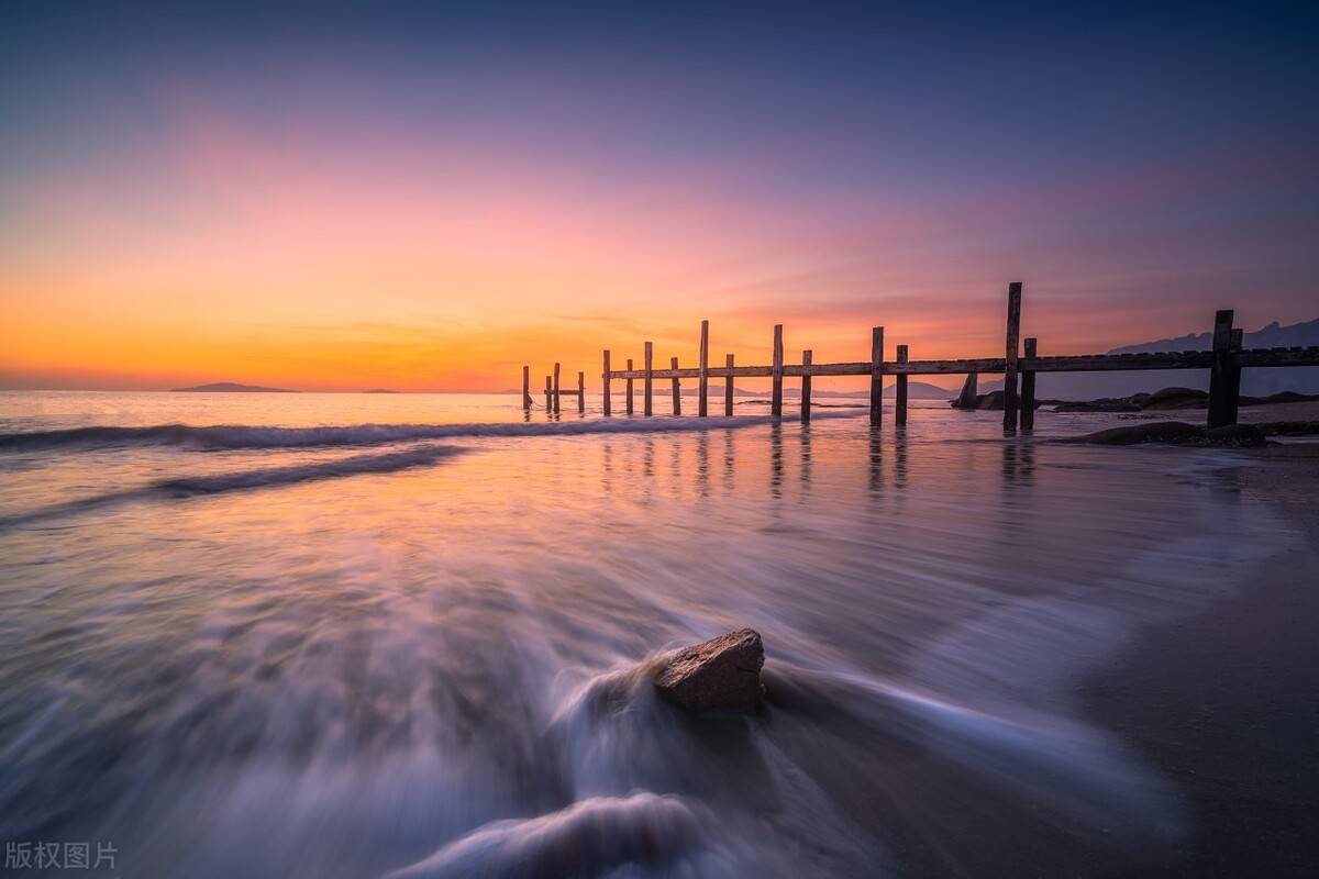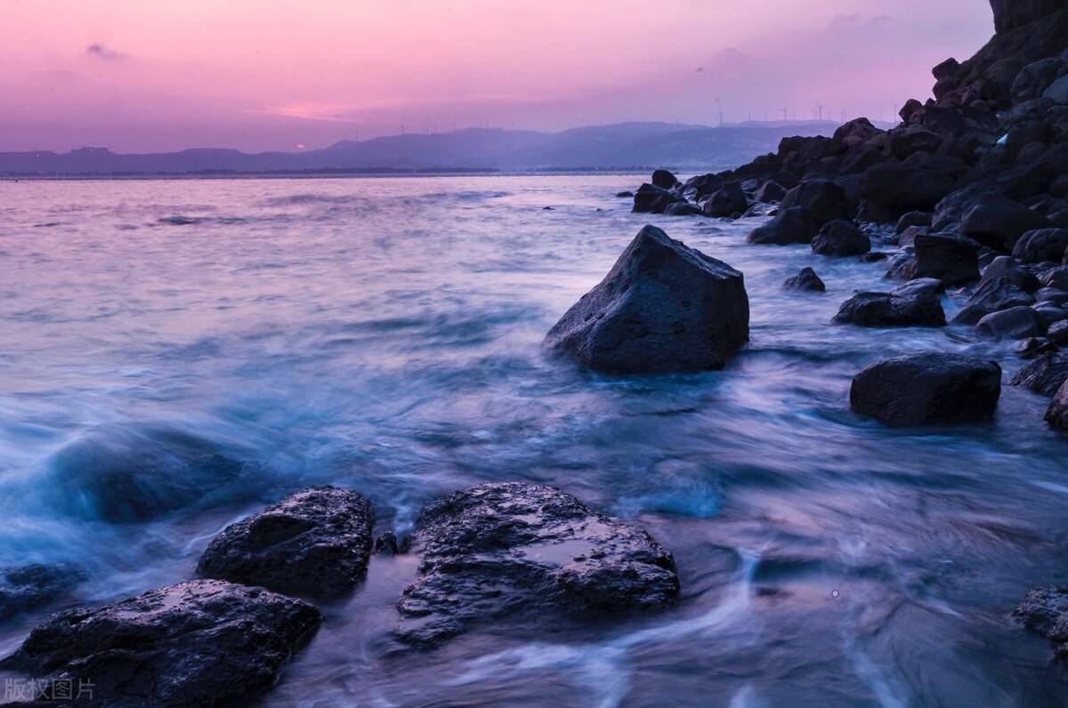 使用慢门拍摄海景,最好是在日落前后,使用广角镜头,设定中小光圈,尽量靠近海景中带有海苔等植物的岩石,使这部分景物得以夸大,这样画面看起来充满生机和活力。