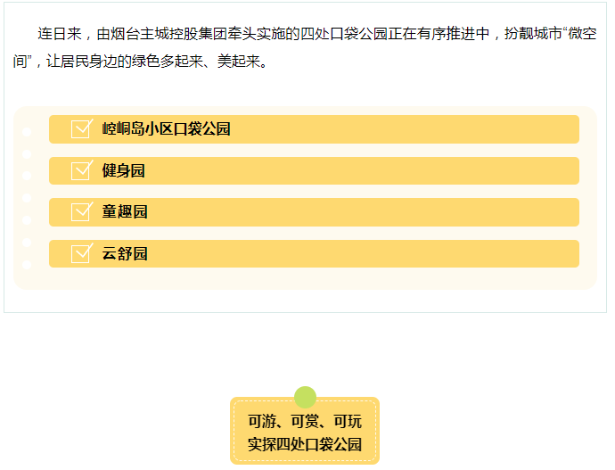 🍃在口袋公园建设过程中,烟台主城控股集团狠抓工程质量建设,强化工程施工管理,根据公园位置“量身打造”,加入科普、互动景墙等文化展示区域,寓教于乐,让口袋公园成为文化传播的重要空间。