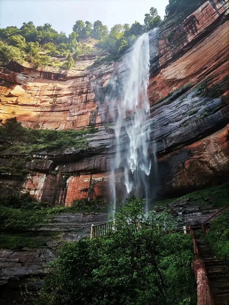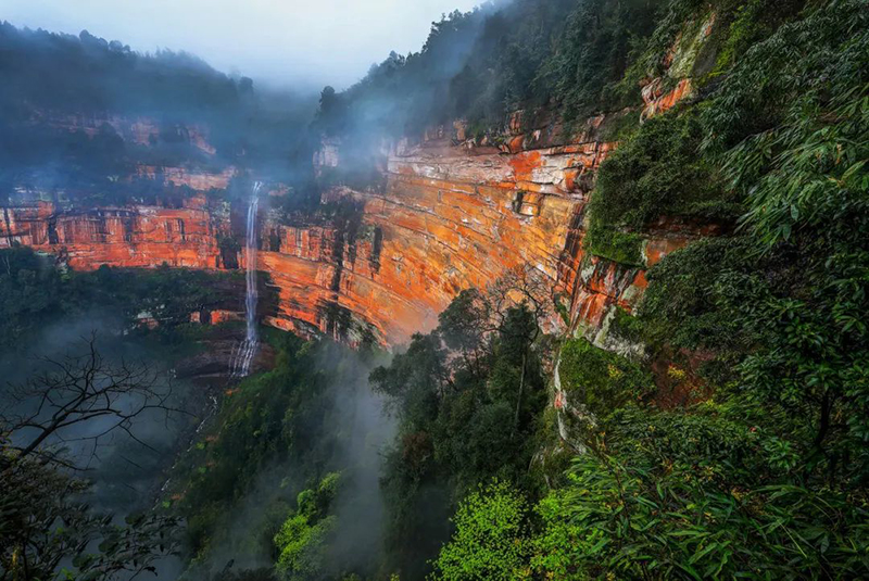 红与绿,是自然界最鲜明对比的颜色。赤水丹霞不只是单一的丹霞地貌,而是点缀在瀑布群、原始森林、竹海、桫椤之间,犹如红宝石镶嵌在绿洲之中,是世界罕见的绿色丹霞景观。