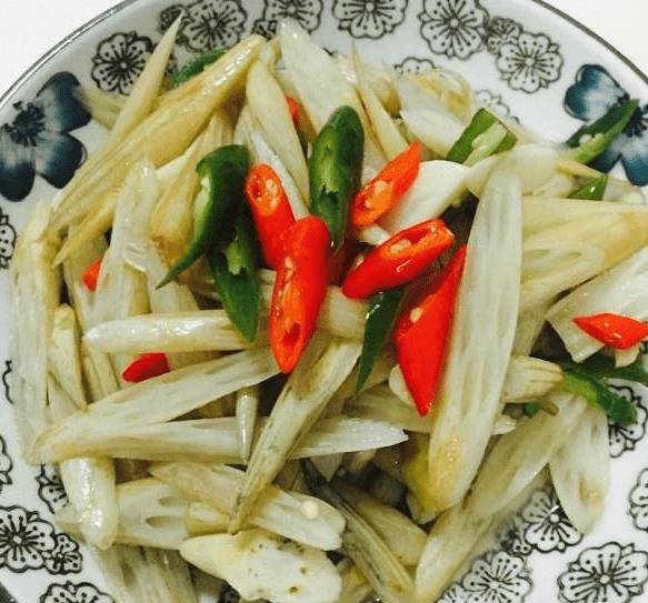 第二步:热锅加入适量食用油。油热后,先将姜、蒜、红辣椒放入锅中激发出香味,然后将莲藕尖倒入锅中,迅速转小火。翻炒2分钟,待藕尖被压碎后,加入盐和鸡精,翻炒至入味,即可出锅装盘。