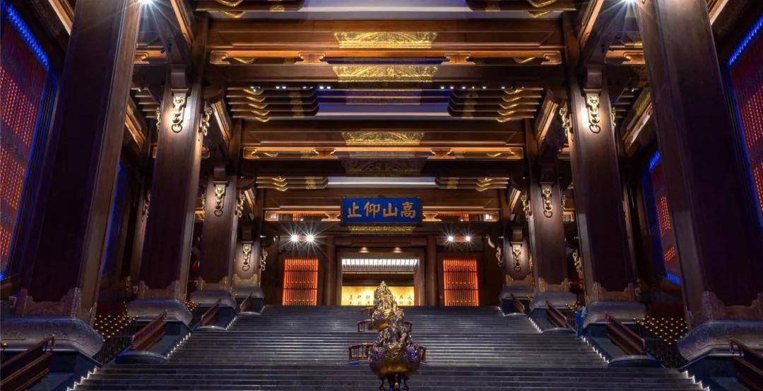 在孔子铜像的旁边有一个大学堂,纵观全球有关于孔子文化的建筑,这里当属第一,它的总高度是65米,内有9层楼,为了充分体现孔子文化,在学堂内设立了一个大学之道,它是通过5组80级的台阶打造而成的,表达的意义就是“不积跬步,无以至千里”。当人们登完这5组台阶之后,便会看到上方有一个匾额,上面写“高山仰止”,下面写着“仲尼之门”。