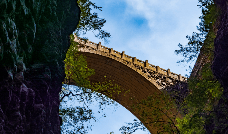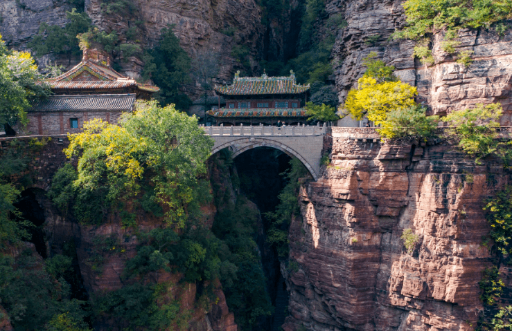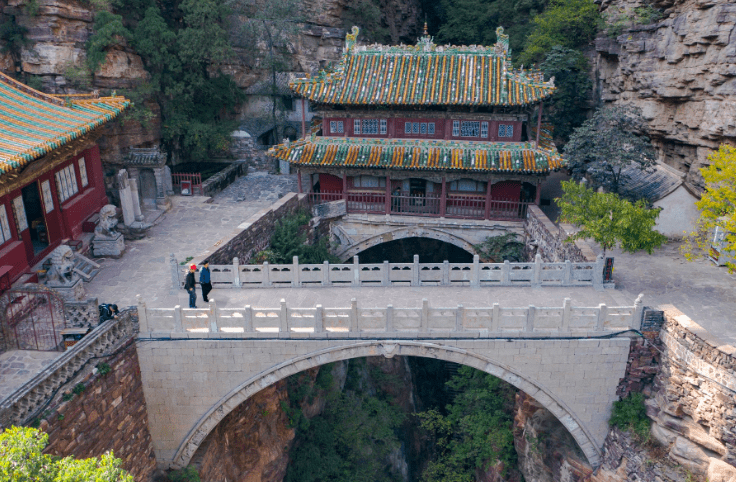 这样的一个横跨景象形成了“桥殿飞虹”的奇观,是苍岩山的三绝之一!桥楼殿的外形酷似赵州桥,从山下看,整个殿宇的支撑就像是赵州桥那般,拱状且优雅,沉稳且深邃。琉璃色配上古青色让整座殿宇看起来异常严肃神圣!