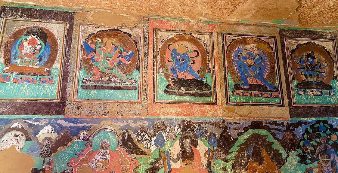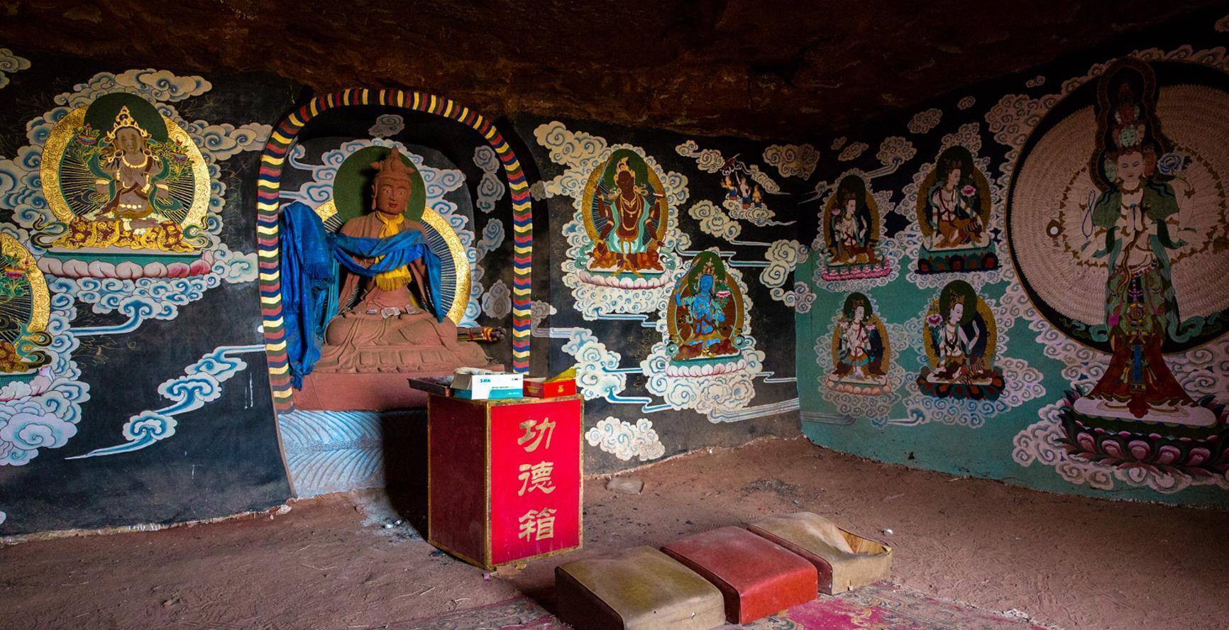 在阿尔寨山顶还修建有寺庙,据传都是为了纪念成吉思汗建造的,当地百姓都会在此地举行礼佛、祭祀场景。壁画以绿、红、黑、蓝、白、黄六种颜色为主,经历了数百年依旧未褪色,极少数壁画是用黑色线条绘制而成,看上去像未完成的作品。壁画内容丰富,技巧精湛老练,人物鲜明,手法多样。