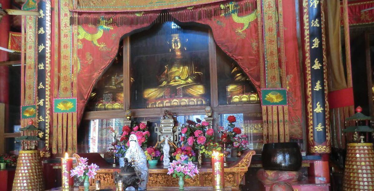 进入寺庙之后,西来寺的主体建筑大雄宝殿是根据史料上的记载重新修建的,与之前的建筑风格几乎一致,整体的颜色以红色为主,大殿内供奉着彩色的三世佛,两侧是十八罗汉,殿内所有的雕像都是木质的塑像,雕工精美,造型丰富。在大殿顶部的飘檐上雕刻的是佛教的吉祥物,在大雄宝殿前方还新增了香座,是铁质用具。