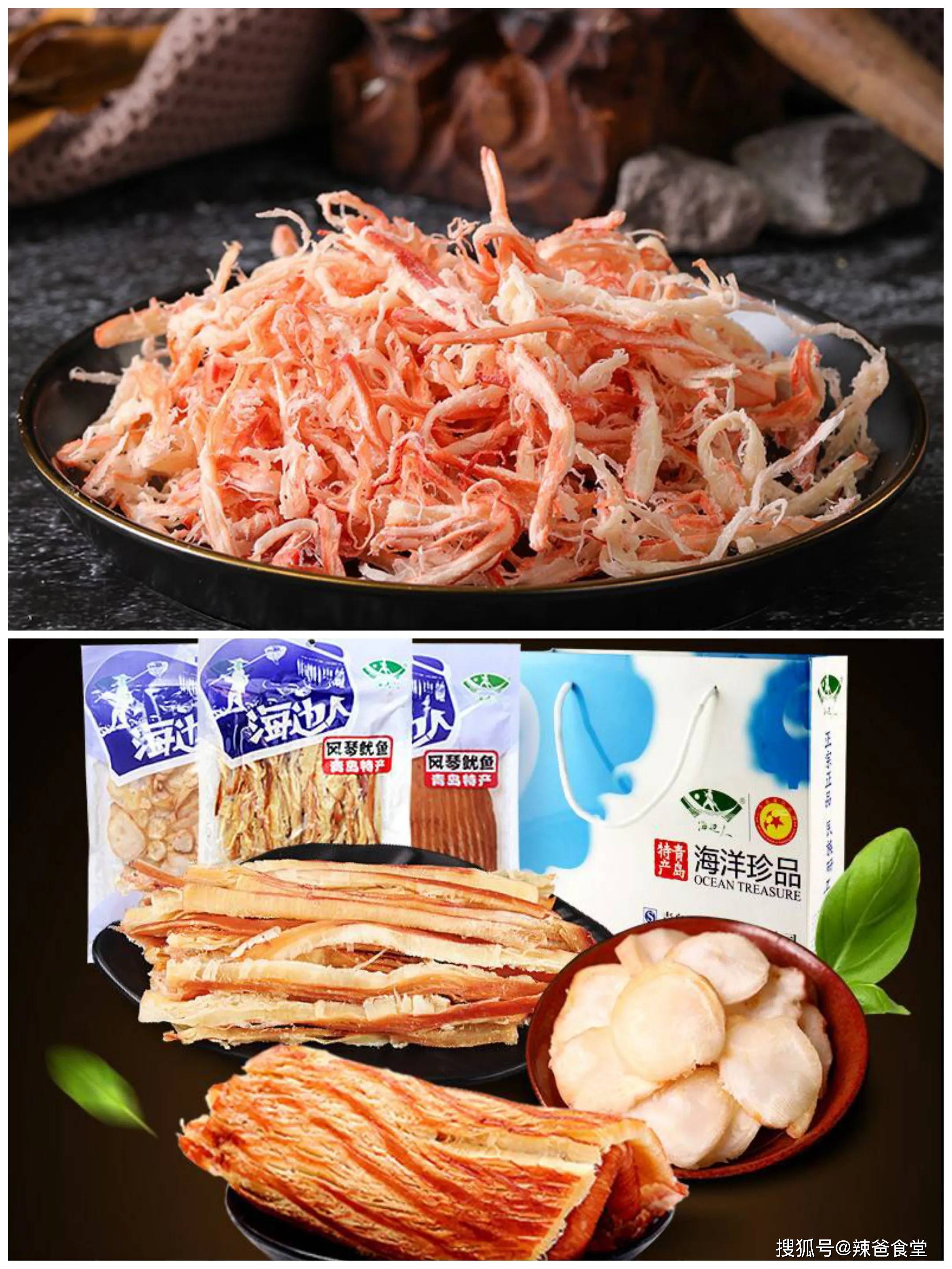 但是除了活海鲜以外,青岛的海鲜类土特产还有干海鲜,尤其是干海鲜零食,非常受欢迎,青岛本地人也常吃鱼片、鱿鱼丝等一些小吃来佐餐、下酒。有两个老字号本地品牌,“大洋”、“海边人”是青岛人常吃的,也是青岛本地人都比较了解的企业。鳕鱼片、安康鱼片、鱿鱼丝、鳗鱼丝等都非常美味。