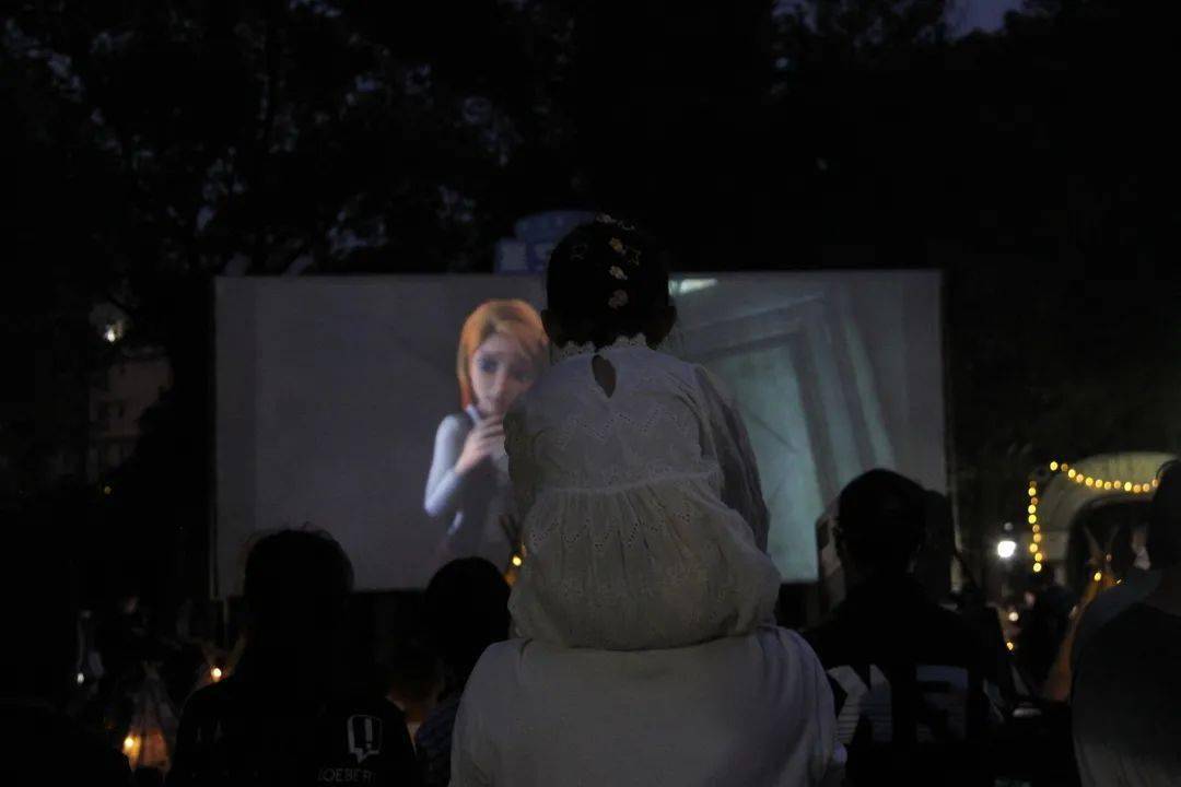 本次“格林童话之夜”充满自然气息,童话集市、立体绘本展、星空影院、格林剧场、林中小径五大场景被置于林木青翠、鸟语花香的北碚公园之中。公园的台阶两旁的树上挂满星星点点的彩灯,灯光与绿叶交织成闪亮的光路指引着小朋友们通往露天影院和剧场。在夜幕下,在树林环绕、微风吹拂中,孩子们和家长坐在帐篷前一同观看电影《灰姑娘》。