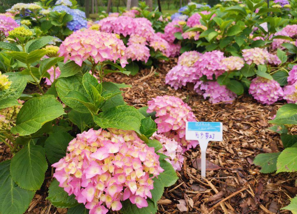 此次奉贤区全域花展以绣球为主题花,在全区种植约5万平方米,总数约10万余株。据花展工作人员梁雪钰介绍,本次花展专门划分出“锦绣花坡”区域,包含4个半圆形展示区,每个展示区大概有400平方米,集中科普展示来自各个国家不同区域的绣球品种。色彩鲜艳、枝干饱满的欧洲绣球热情奔放,蓝色静谧、小巧精致的日本绣球小家碧玉,色彩丰富多样、花开繁密的中国绣球“易多梦幻”花如其名,老枝新枝都能开花的美国绣球则代表了“无尽的夏天”。