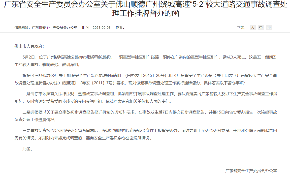 5月2日,位于广州绕城高速公路佛山市顺德区勒流路段,一辆重型半挂牵引车碰撞一辆停在车道内的重型半挂牵引车,造成3人死亡,由于这是五一假期发生的较大事故,影响恶劣、教训深刻,广东省安全生产委员会办公室决定对该起事故调查处理工作实行挂牌督办。>>>详情