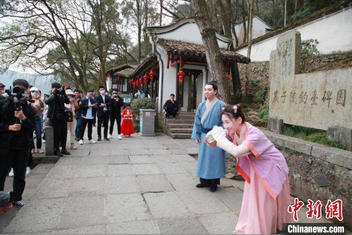 走在严子陵钓台,一路不时会遇到古装打扮的渔父、高士、书生、仕女、樵夫,他们或江边垂纶,或牧笛横吹,或泉边烹茶,或亭中抚琴,或山中砍柴,或石上对弈,或松下闲谈……游客俨然进入了《富春山居图》中,人在画中游。