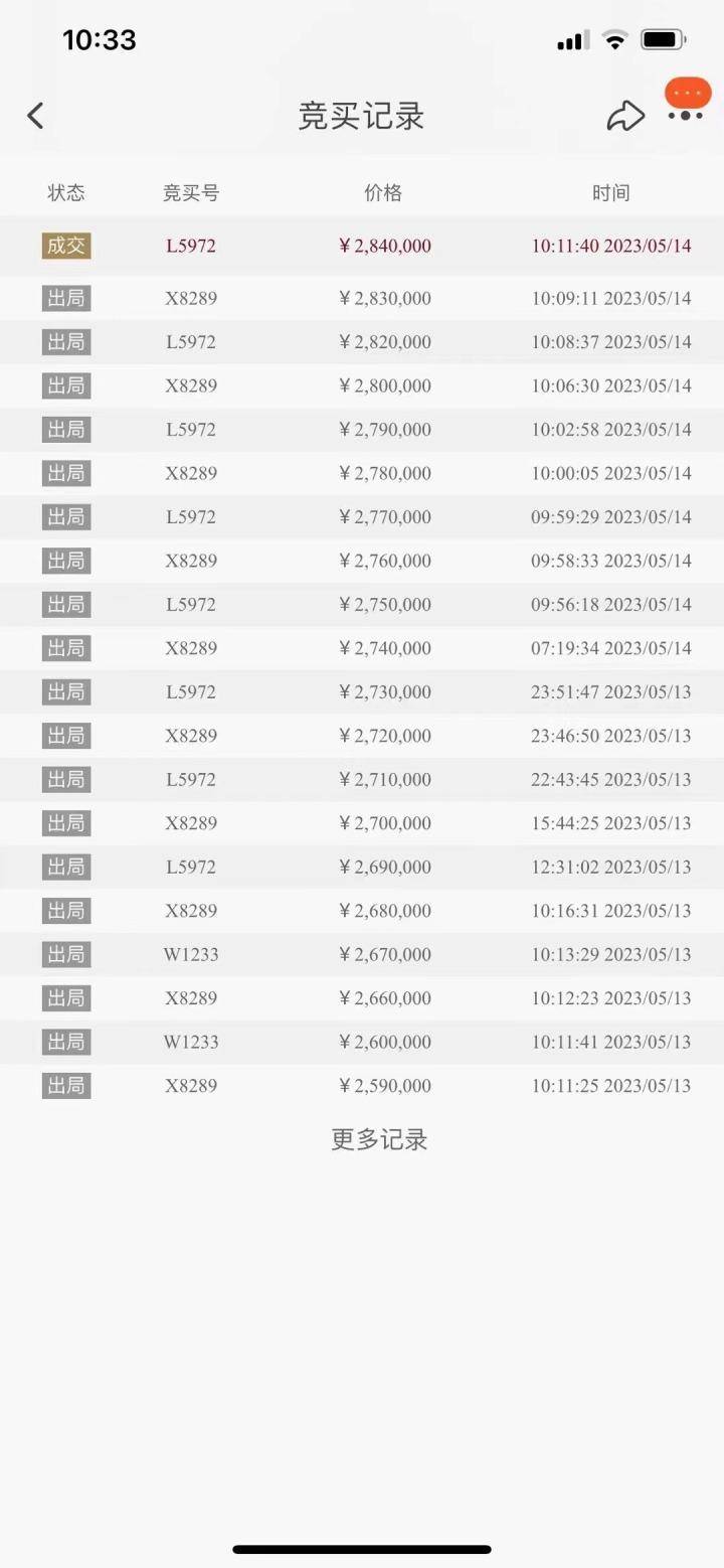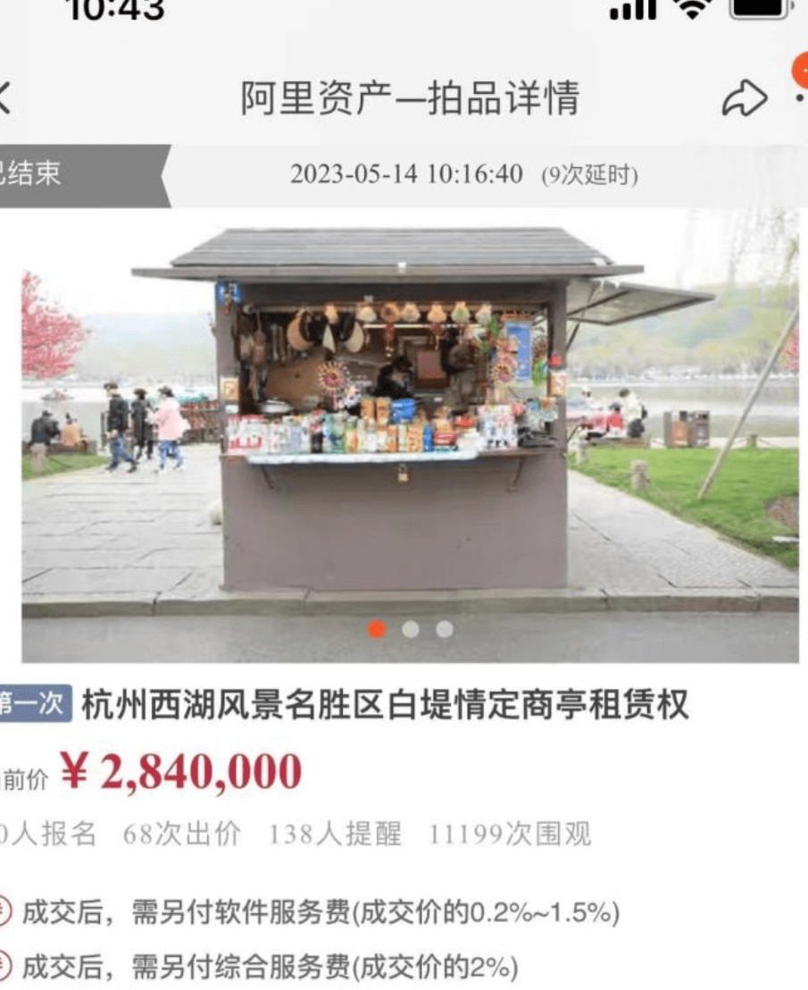 5月14日上午10:16,经历了68次竞价,杭州西湖风景名胜区白堤情定商亭租赁权拍卖有了结果,190万起拍,最终成交价284万,溢价近50%。
