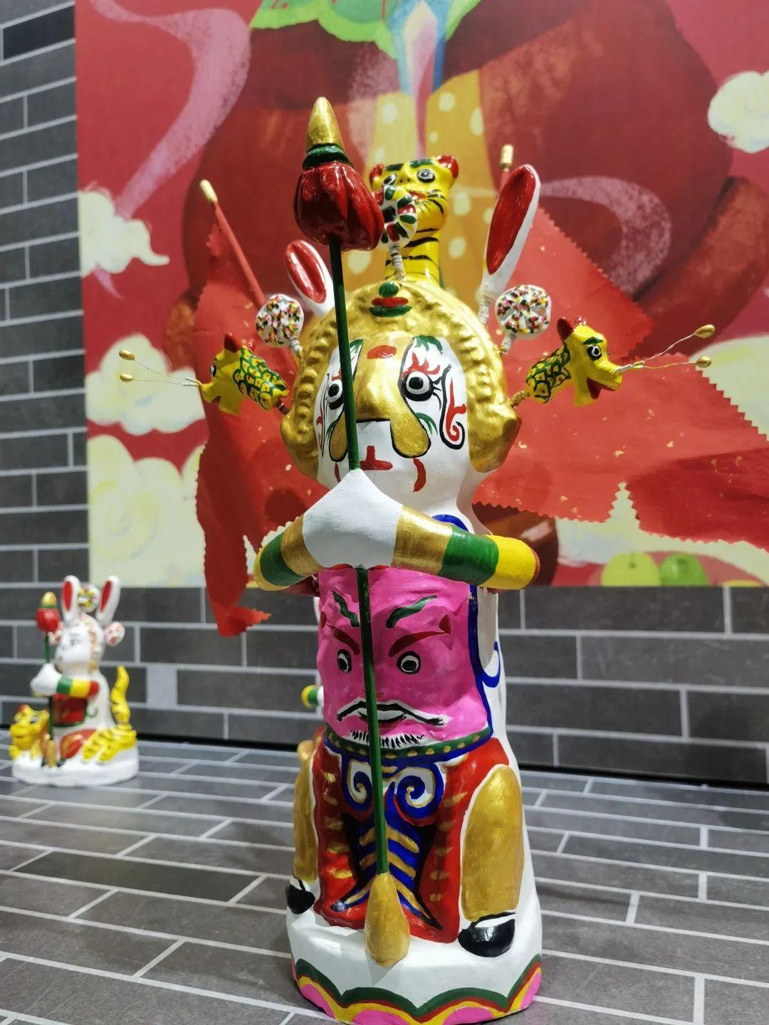 传统泥塑兔子王白面红唇、兔面人身,长长的耳朵与头部之间用弹簧相连,有的身着红袍、背插红旗,有的手持药杵稳坐虎骑之上,造型别致。