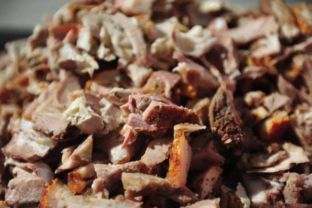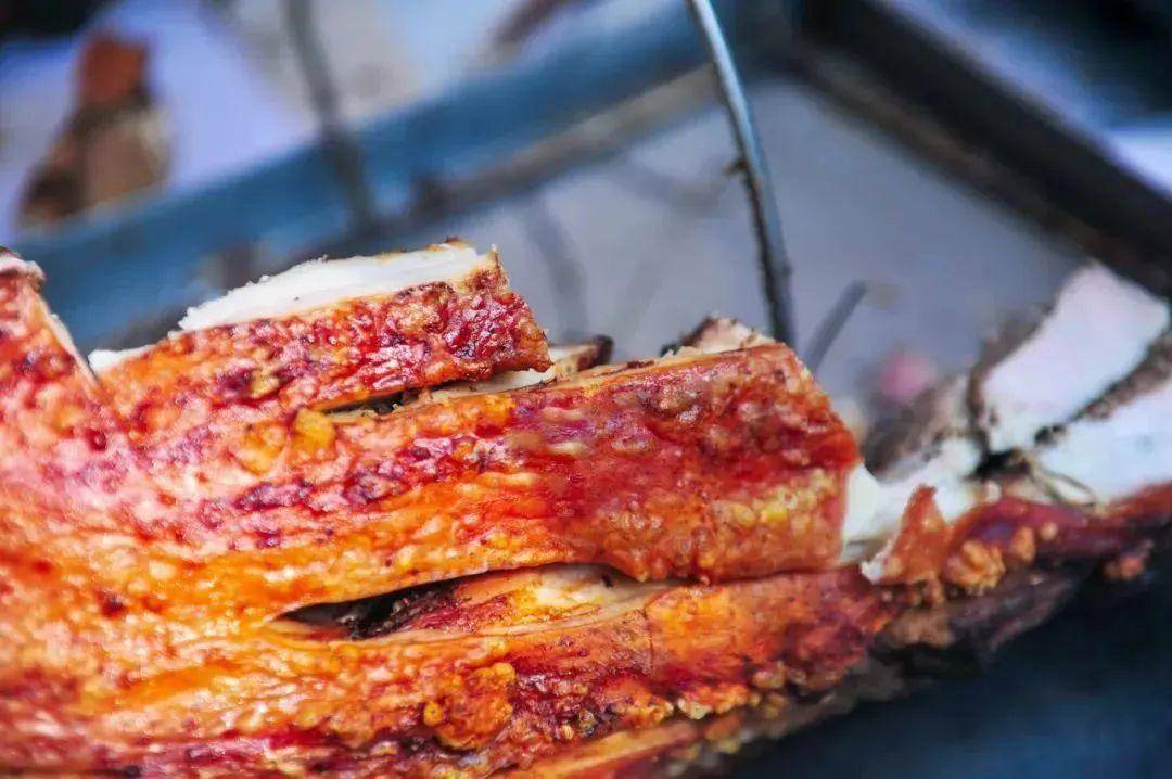 黄家烤肉的做法也极其考究。选取200斤左右的大猪,遵循古法,经过剔骨、划肉、腌制、支猪、牵眼、贴纸、烧炉等多道工序,吊挂在三米见方的土炉里焖烤,出炉技艺讲究全凭师傅经验。