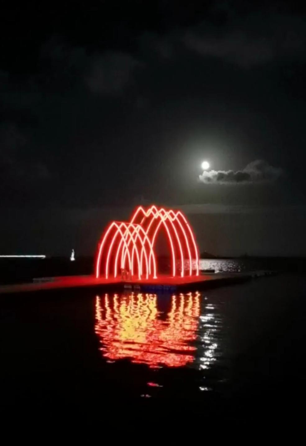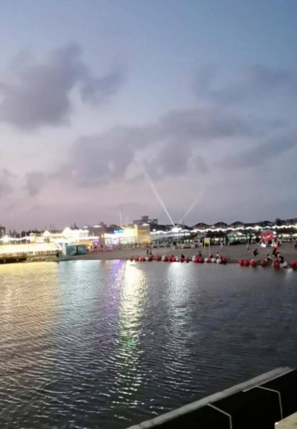 小阿兵站在远处望去只见高大弯弯的圈子被灯光围绕着发出万丈光芒令人沉醉其中的感觉,旁边的海滩水呈现出美丽的灯光倒影又是另一番美景,这座海滩是围起来的海滩,也就是人工的海滩,里面的水非常干净,非常清澈见底,游客可以玩沙子、海里游泳、垂钓、等等