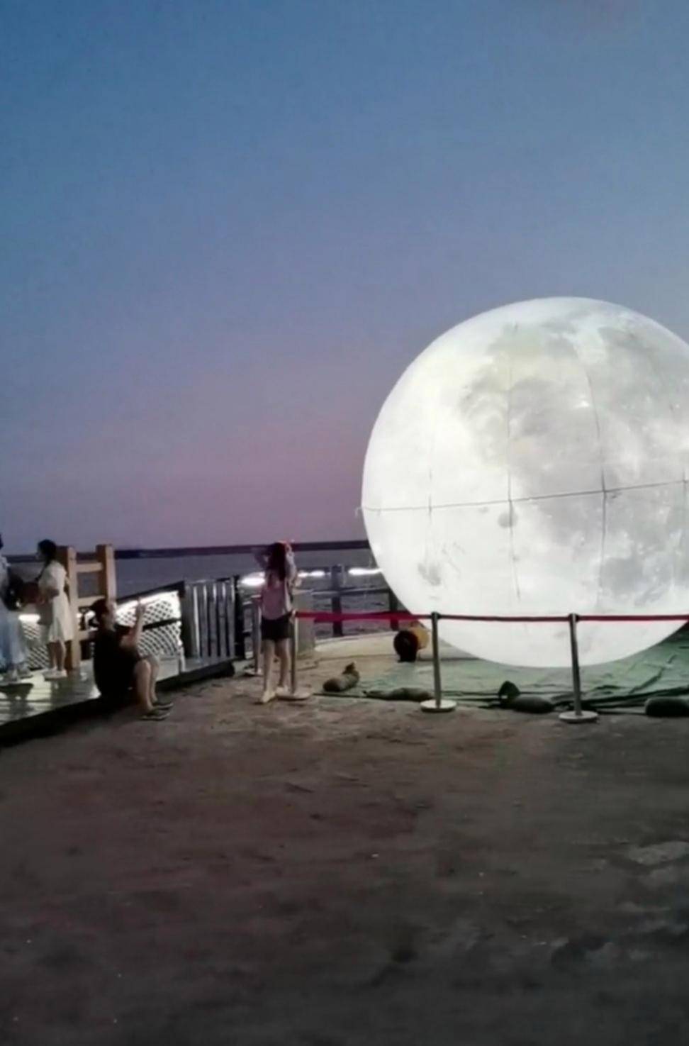 小阿兵漫步行走在海滩上一边欣赏着美丽的夜晚海景,一边在给大家献唱动人的歌曲,挤满了游客观看,各种欢笑声,场面如此热闹,如此庞大,有的游客拿着手机拍摄,有的游客在仔仔细细的倾听小阿兵动人的歌声,绝美的圆球好比天上的一轮明月,周围也是挤满了游客在取景哦