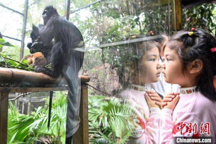 黑叶猴宝宝“想你”吸引游客。 陈骥旻 摄