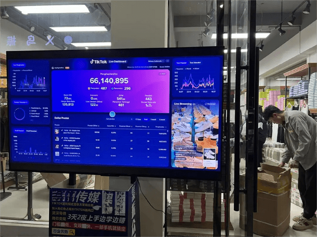 即使在最不起眼的库存街拖鞋店铺里,老板娘也可以熟练使用英语,跟外贸客人们谈价格。江北下朱的一家鞋店门口,一块大屏幕实时跳动着TikTok直播间的数据。