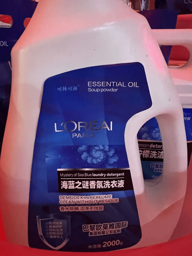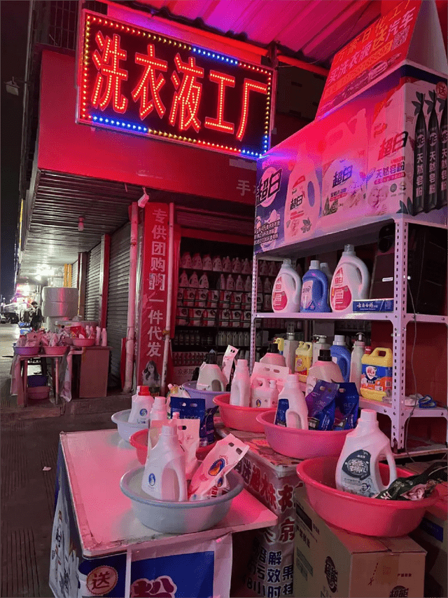 一些已经下班的店铺,门口展板上的样品并没有收起来。在一家日化用品店门口,我看到了海蓝之谜的洗衣液、挚美净洗衣液、浪宇皂粉、飘淼洗衣粉——在电商直播兴起之前,它们活跃的市场应该是农村大集。