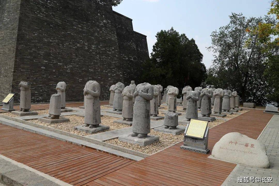 在武则天及唐高宗的陵草前,伫立着64尊藩臣石像,如今只剩下61尊。他们所代表的是唐朝的盟国或友好邻邦。在唐帝国鼎盛时期,这些国家的使臣每年都会带着礼物来到长安,那些珍奇异兽让一路上的人们大饱眼福。