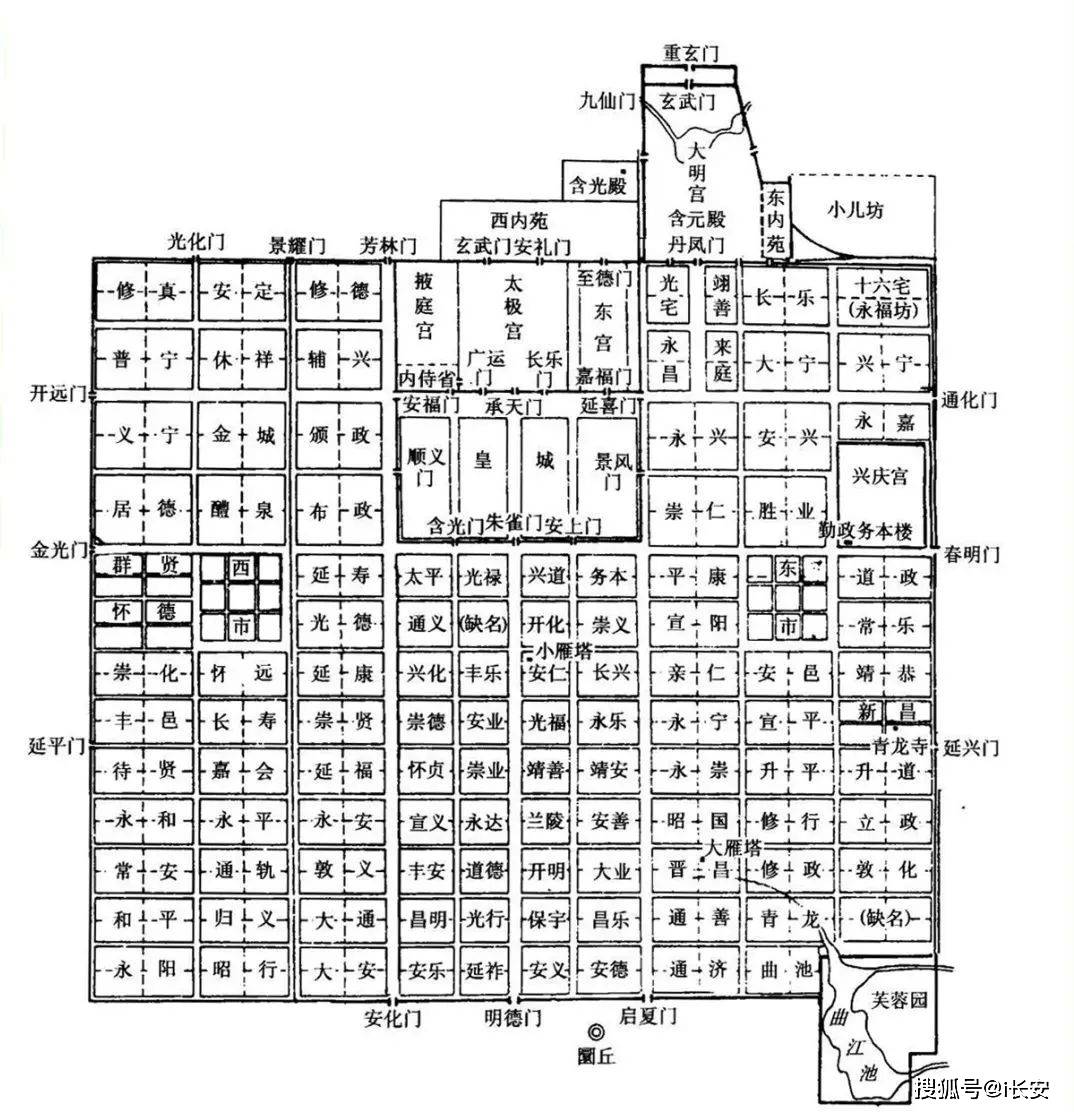宫城居都城北部正中,为规整长方形,周长8600米,面积约4.4平方公里。太极宫位居宫城中央,宫城东部为太子东宫,西部为宫女居住的掖庭宫。皇城位于宫城南面,平面成规整长方形,周长9200米,面积5.2平方公里。南面正门朱雀门与承天门及外郭城的明德门在一条线上,长安城中最重要的朱雀大街就因此门得名。这条大街的宽度有150米,即使是今天的城市也罕见如此宽的街道。里坊是居民住宅区,各坊均有名称,平面呈成正方或长方形。外郭城也叫京师城,一共建有13个门。
