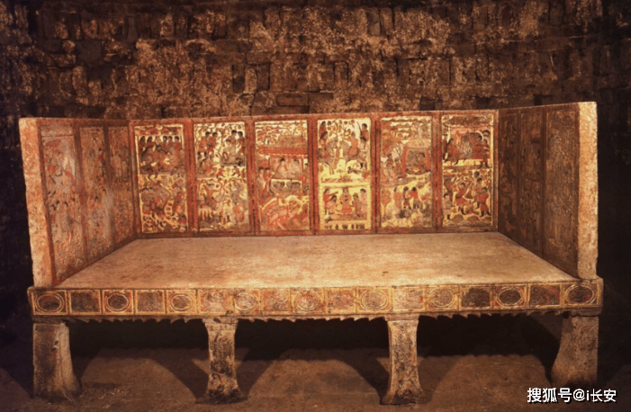 康业墓的墓主人在下葬的时候安睡在石板制成的床榻上,床榻的三面围屏以线刻图画展示了他生前的活动。在方形石板上镌刻的397个魏体文字的墓志铭讲述了墓主人的详细身份。