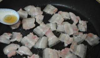 而洋葱呢,则需要切成丝,红辣椒只要切成条状即可。五花肉在选择的时候要选那种肥肉多一些的,然后切成薄薄的一片,之后将它装入盘中,撒上一些红薯粉和料酒,用姜片搅拌一下。接下来我们就要开始将锅底烧开,倒入少许食用油,加入切好的五花肉煸炒,把肥肉里的猪油逼出一部分,盛盘备用。