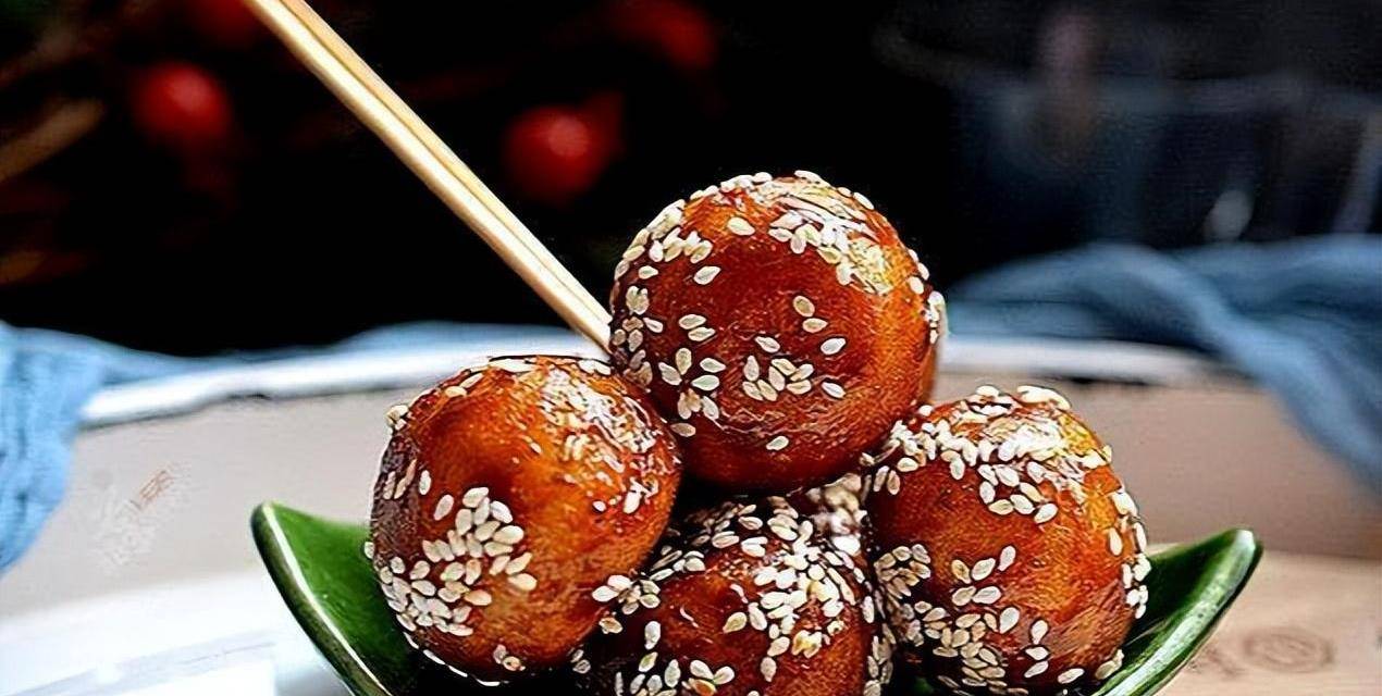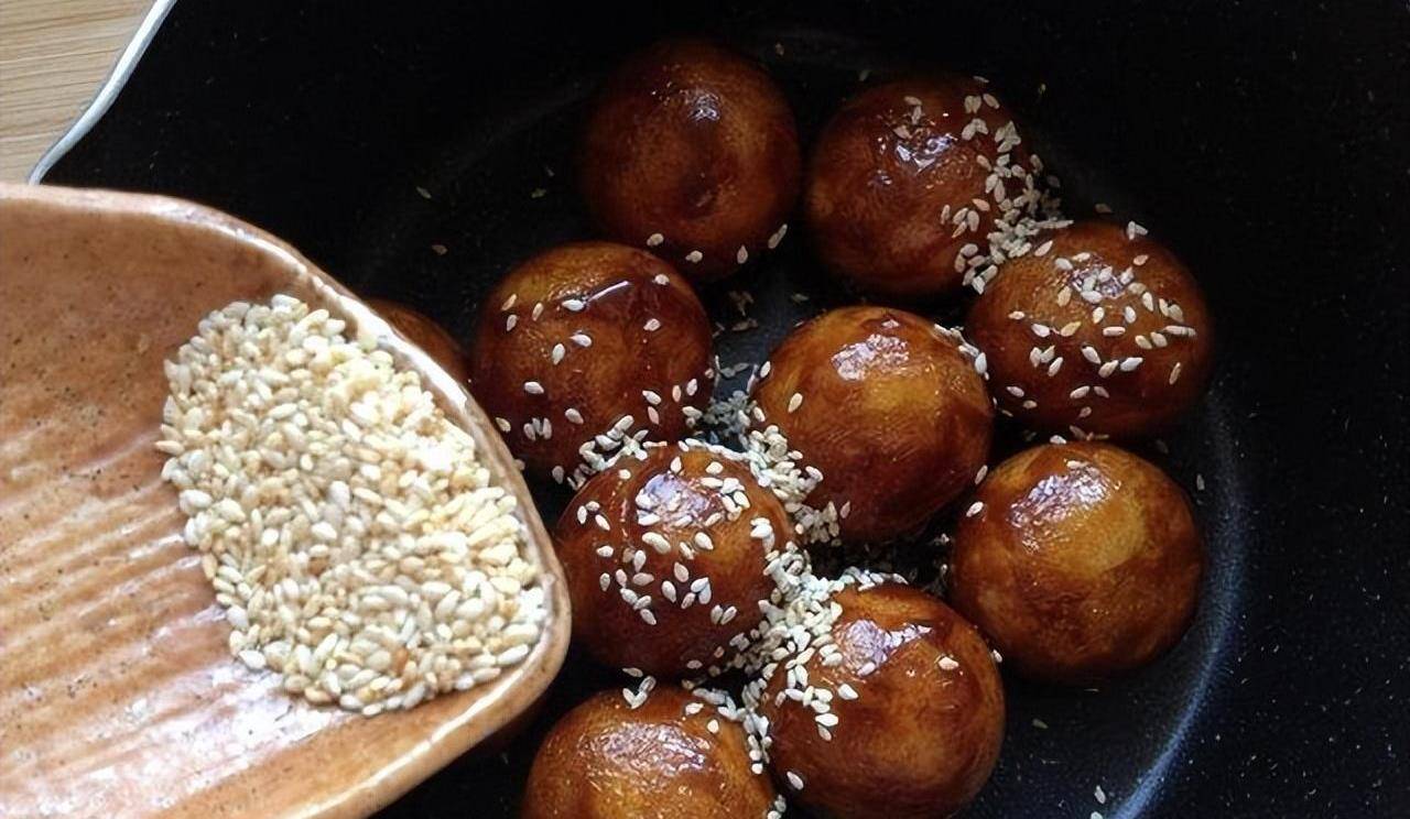 等油果子 沾满红糖,外表焦黄,外壳变硬就可以关火了。关火后盛出,趁热在上面撒上一些熟的白芝麻就好了。