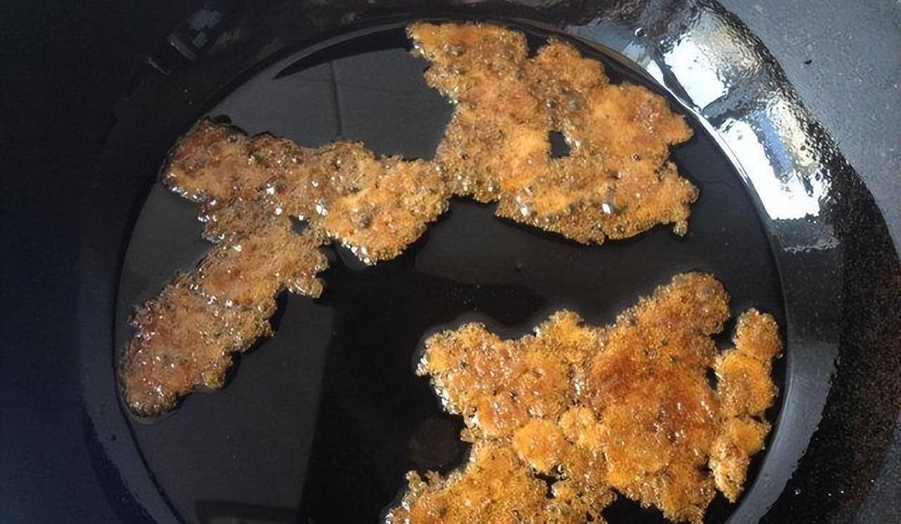 2、炸过的油不要浪费扔掉,可以等油温降下来,红糖沉底后,就可以用上面的油了,但是炸过东西的油不要再炸别的食物了。