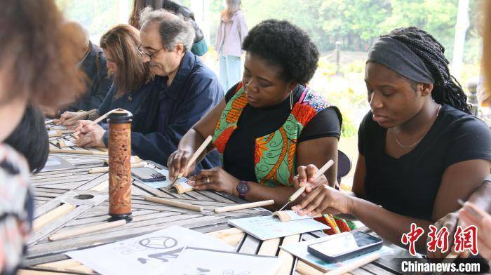 外交官们体验嘉定竹刻。 华东师范大学供图