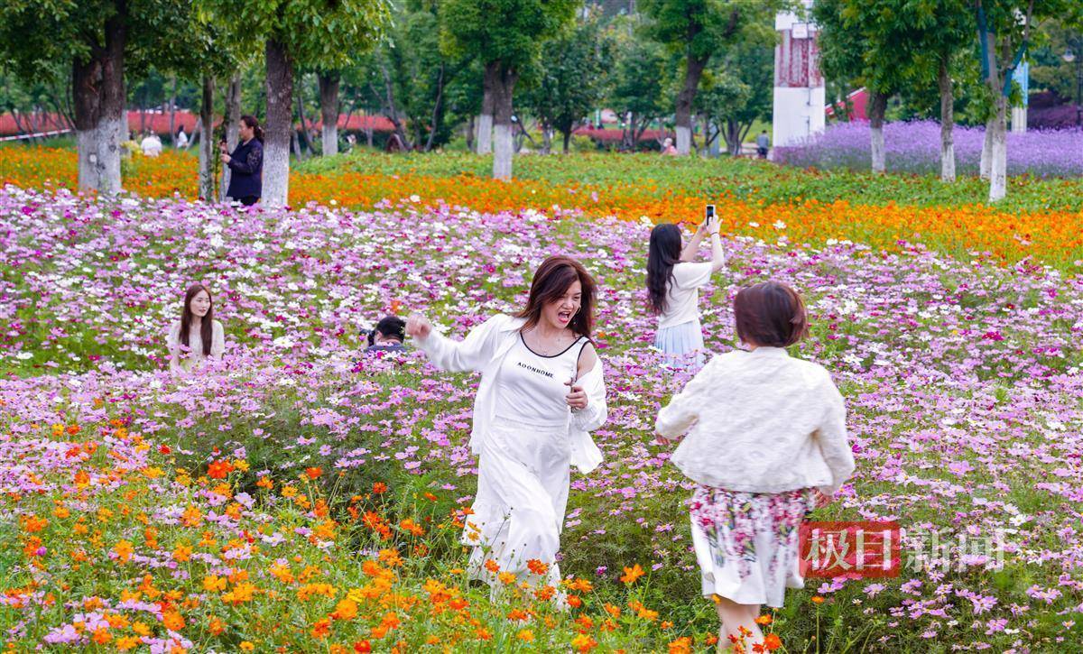 “柳叶马鞭草最高,波斯菊和硫华菊次之,百日草打底,色彩自然层次分明,画面感超强!”游客胡女士带着家人来拍大片。