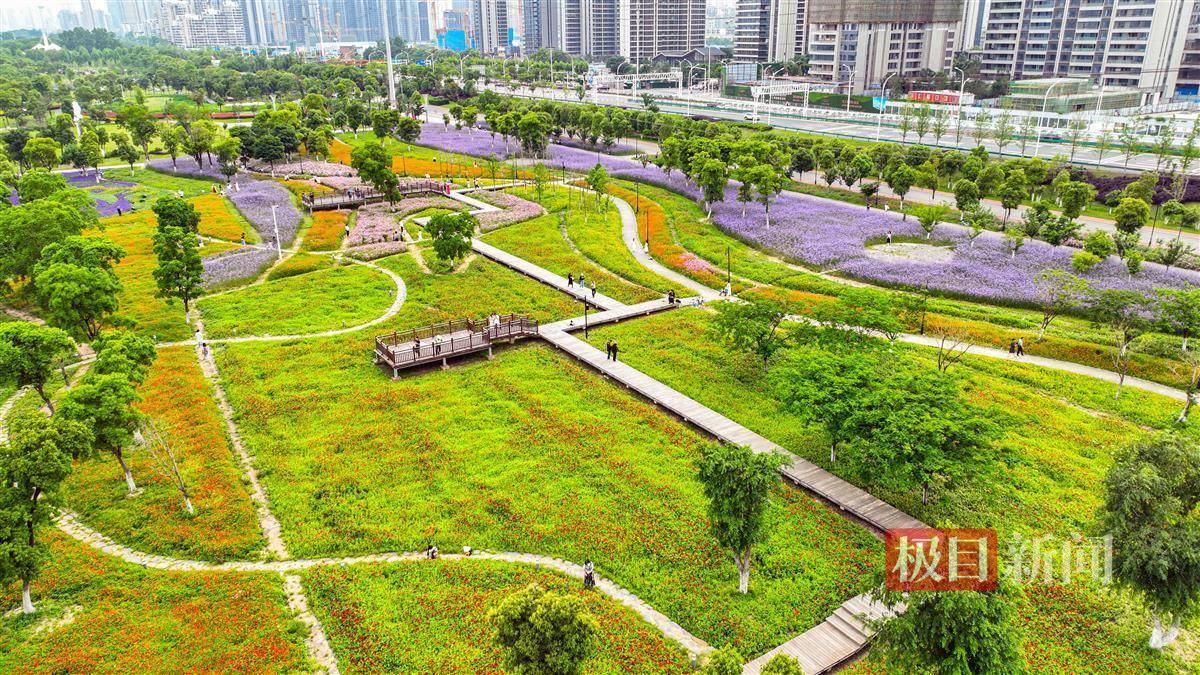 今日上午(14日),记者来到汉口江滩四期,柳叶马鞭草开花正盛,营造出紫色的烟云梦幻,或粉或白的波斯菊花瓣轻盈可人,橙红橙黄的硫华菊特别抢镜耀眼,而大红或金黄的百日草处于初花期,正淡定地拔节向上,开出朵朵花。