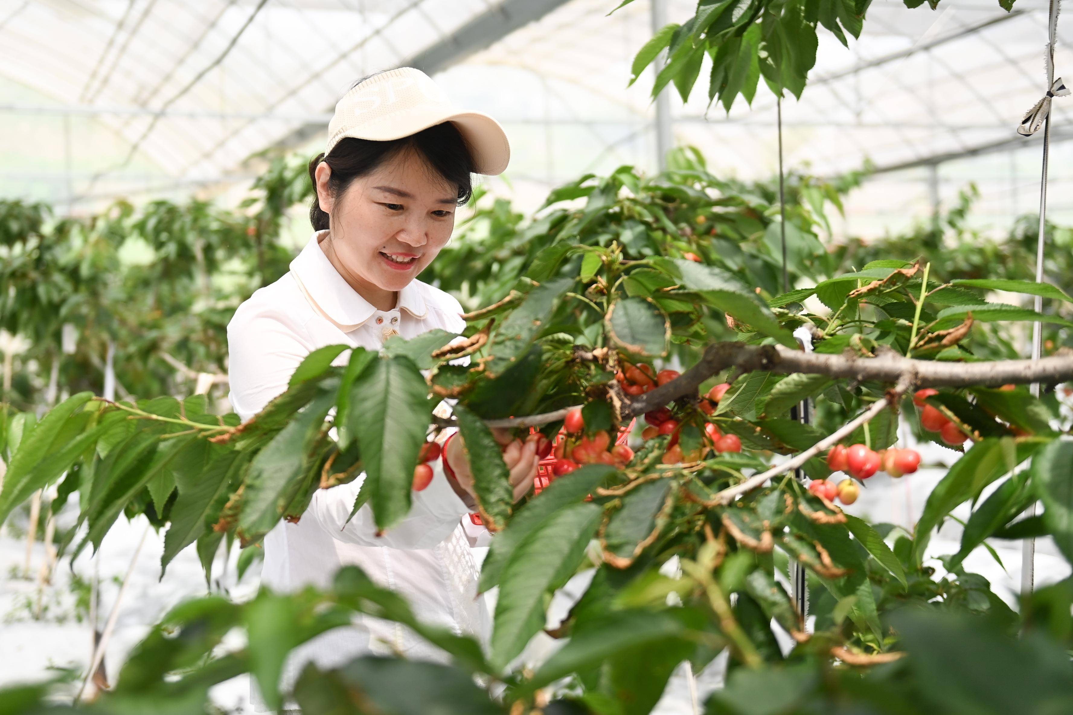 5月14日,游客在桐庐县莪山畲族乡塘联村“水果共富工坊”内采摘大樱桃。 新华社记者 黄宗治 摄