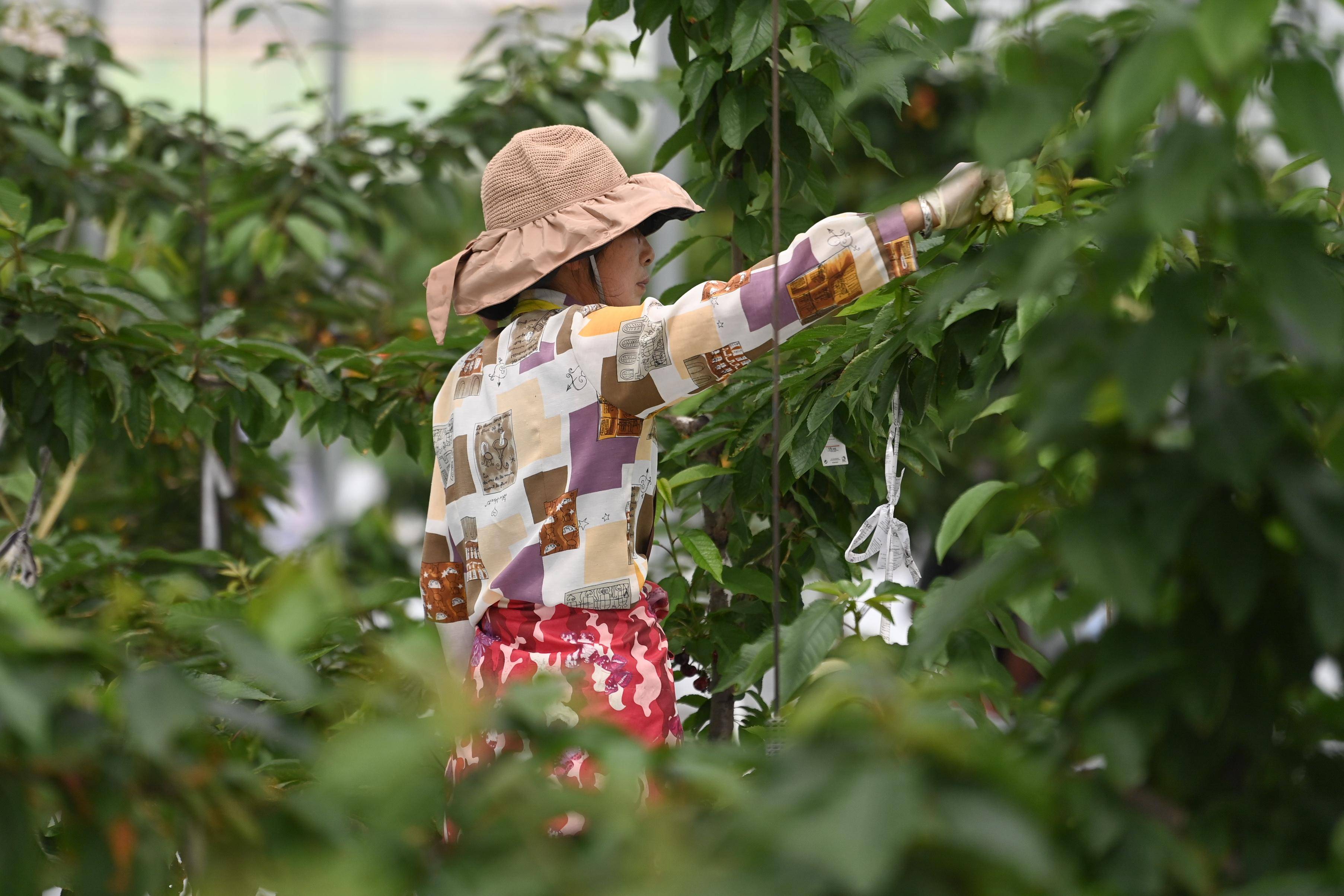 5月14日,农户在桐庐县莪山畲族乡塘联村“水果共富工坊”内对大樱桃进行修枝养护。 新华社记者 黄宗治 摄