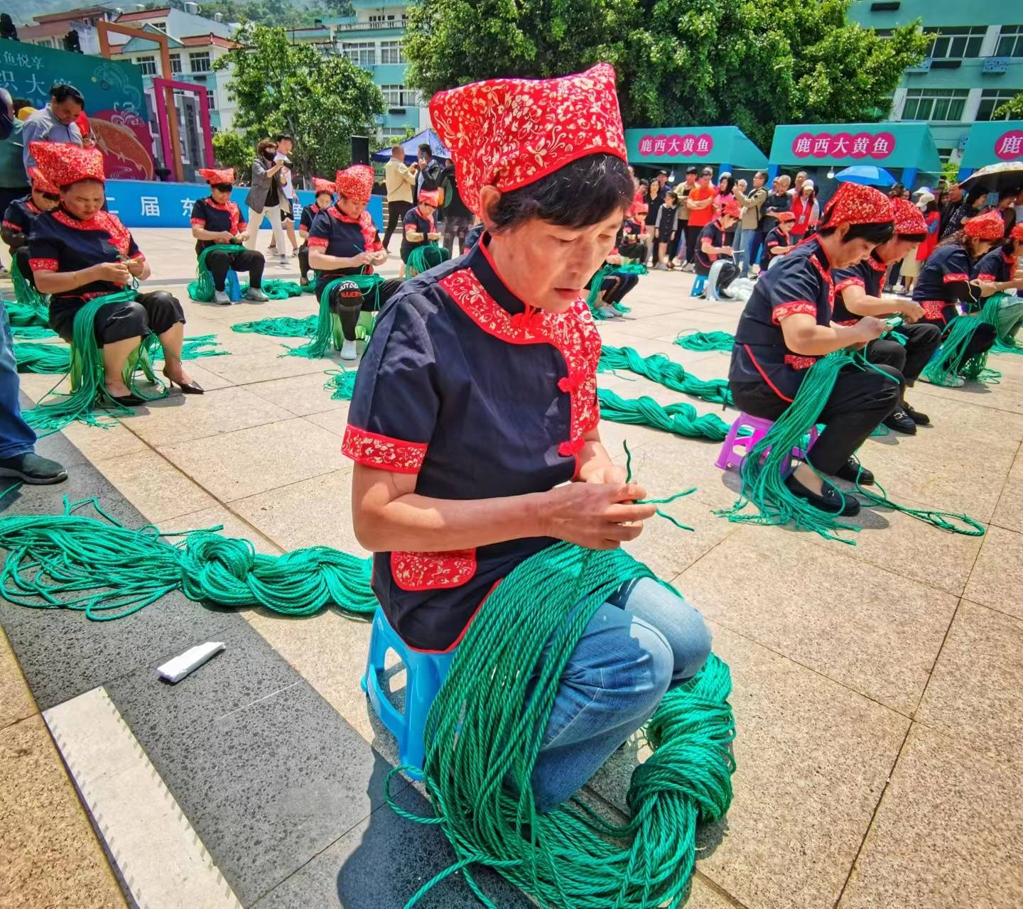 上午的手工渔网编织大赛作为预热环节,吸引了大量游客前来观看,巧手渔嫂们早早地换上独具特色的比赛服饰,红色上衣搭配深蓝色裤子,个性十足。只见梭子在渔网中穿插飞舞,不一会儿,一张张渔网冲头就做好了。此次技能大赛吸引了20名渔嫂参加,年龄从38到62岁不等,最后评出3个“巧手奖”,游客们也对下午活动正式开幕产生了浓厚的兴趣。