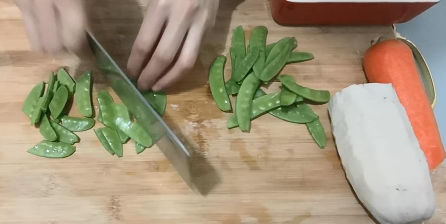 将莲藕切片,胡萝卜切成滚刀片,荷兰豆大家觉得长的可以拦一刀,觉得正好的就可以直接保留原长度