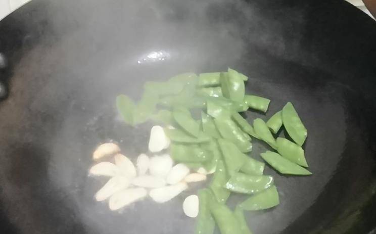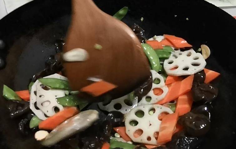 锅中加入少许油,然后用蒜片爆锅,然后放入荷兰豆炒香,放入藕片和木耳继续翻炒,最后放入胡萝卜