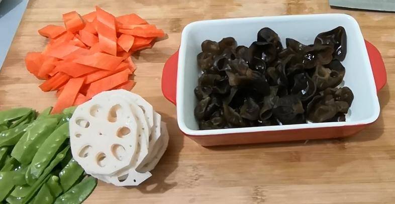 首先准备荷兰豆、莲藕、胡萝卜、木耳,吃多少大家根据自己的需求来就可以了