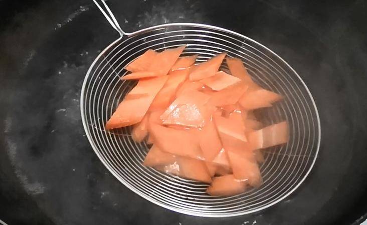 然后锅中烧水,依次将几种食材放入锅中焯水,先焯胡萝卜,10秒钟就可以,以内胡萝卜还是生的状态味道好吃,太熟了就有点甜软