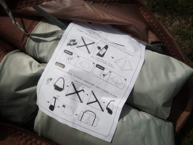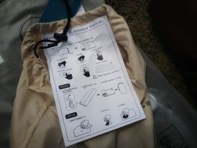 帐篷和睡垫都有自己的收纳包,为了便携帐篷的收纳包还有提手设计,打开帐篷的收纳包,首先可以看到的是使用的说明,充气、打地钉、收纳的方式图文并茂,很细致、很贴心。一看就会用了。